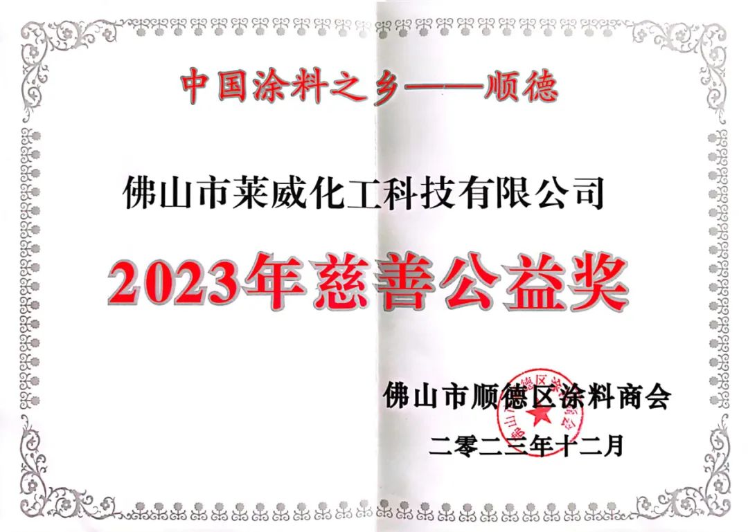 佛山市萊威化工科技有限公司作為順德涂料商會會員單位及理事單位應邀出席。在慶典上,萊威化工公司憑借其在公益事業中的突出貢獻,一舉攬獲2023年慈善公益獎。作為佛山市一家**的化工企業,萊威化工公司自成立以來一直秉承“責任、創新、發展”的企業理念,積極履行社會責任,關注環保、公益事業。公司不僅在生產經營方面取得了顯著成績,更在公益領域展現出高度的社會責任感。這一獎項是對公司在公益事業中的突出貢獻的認可和表彰。